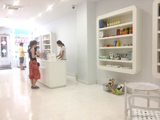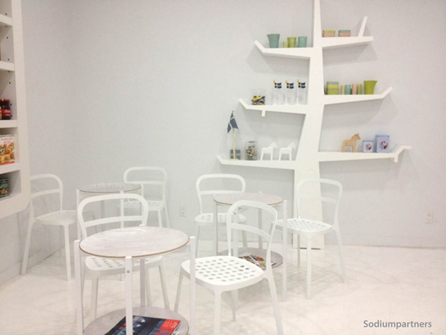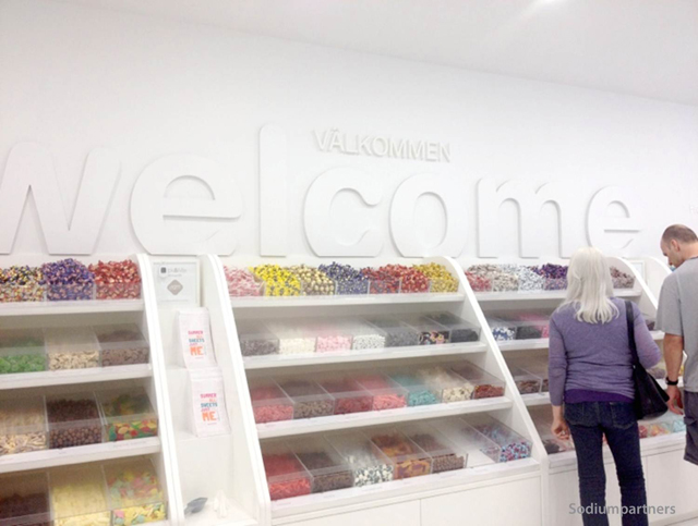 The starck white interior serves as a canvas for the colorful variety of Swedish candies displayed